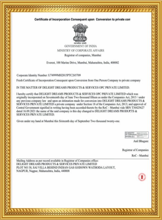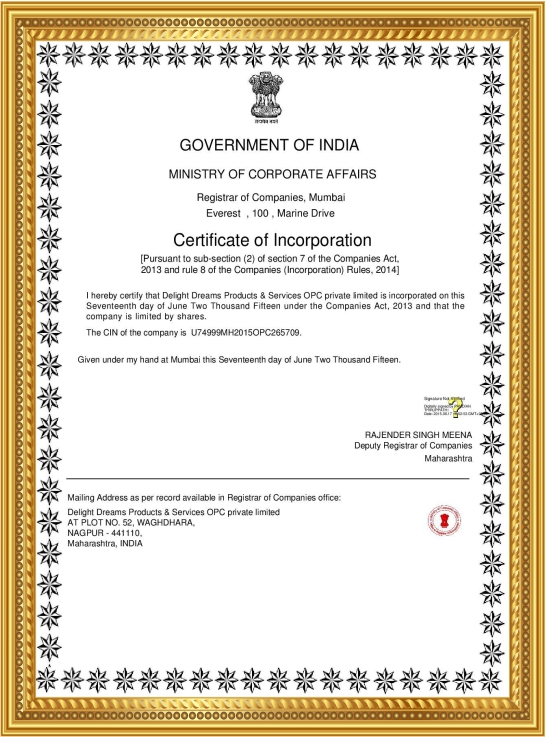 Certificate Of Ministry Of Corporate Affairs